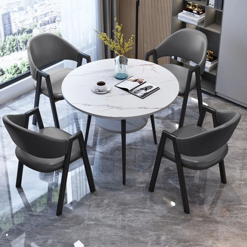 80cn大理石模様円卓+4ダークグレー色レザー椅子