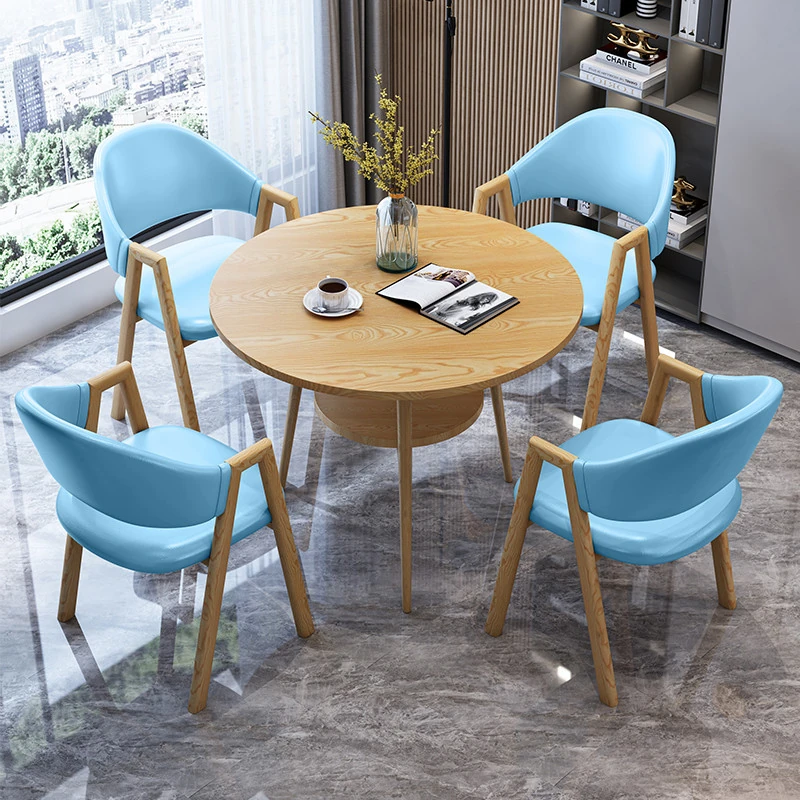 (80ナチュラルウッド色円卓+4レザー椅子)ライトブルー