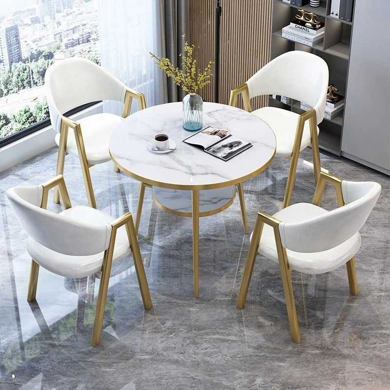 80cn大理石模様円卓+4ホワイト色レザー椅子