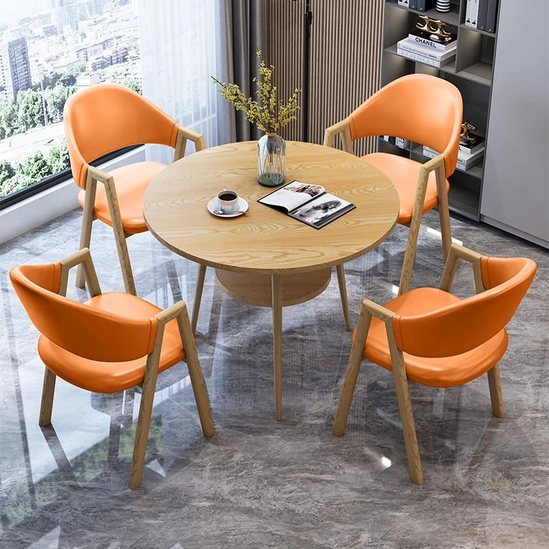 (80ナチュラルウッド色円卓+4レザー椅子)オレンジ色