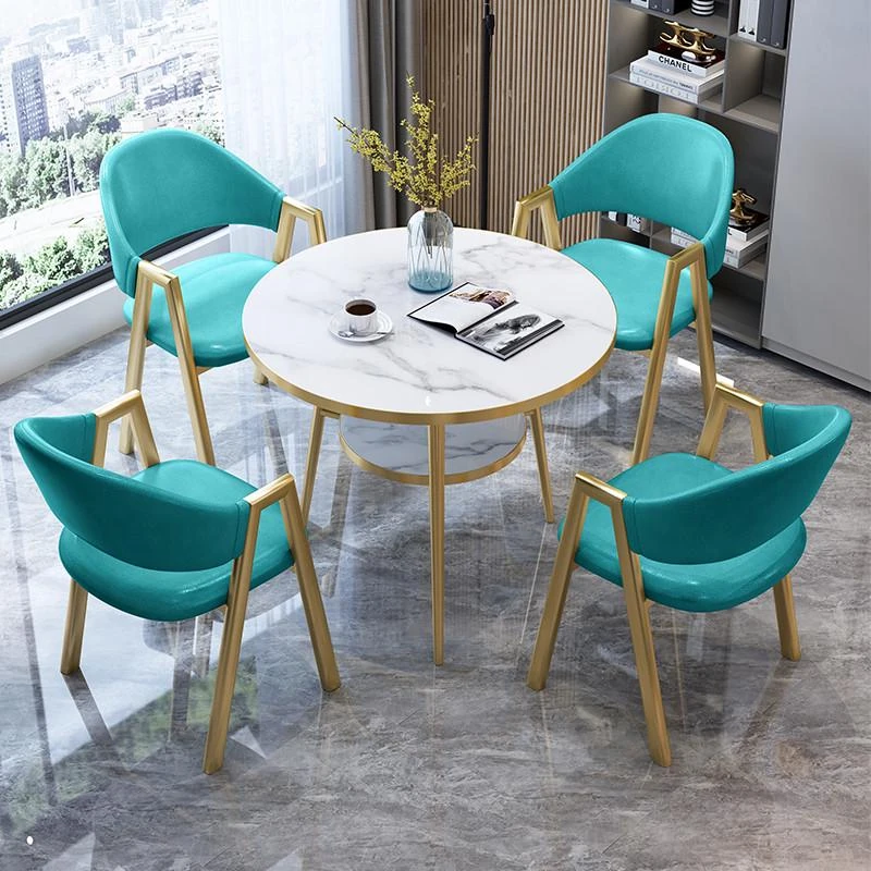 80cn大理石模様円卓+4ブルー色ファブリック椅子
