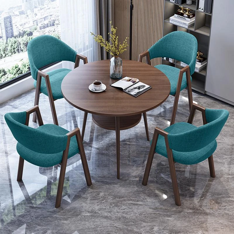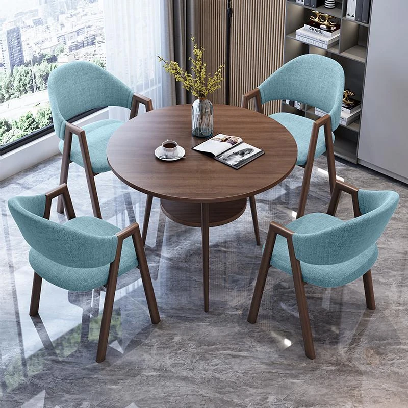 ライトブルー(80ウォールナット色円卓+4ファブリック椅子)