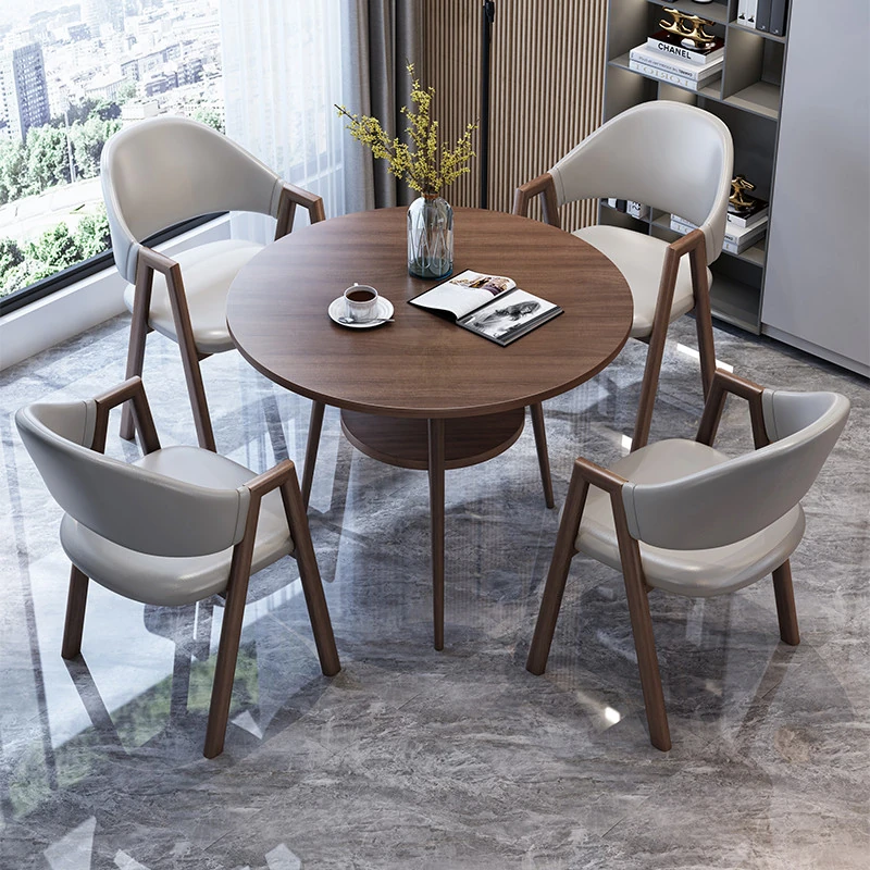 80cnウォールナット円卓+4ダークグレー色レザー椅子