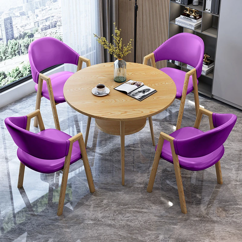 (80ナチュラルウッド色円卓+4レザー椅子)紫色