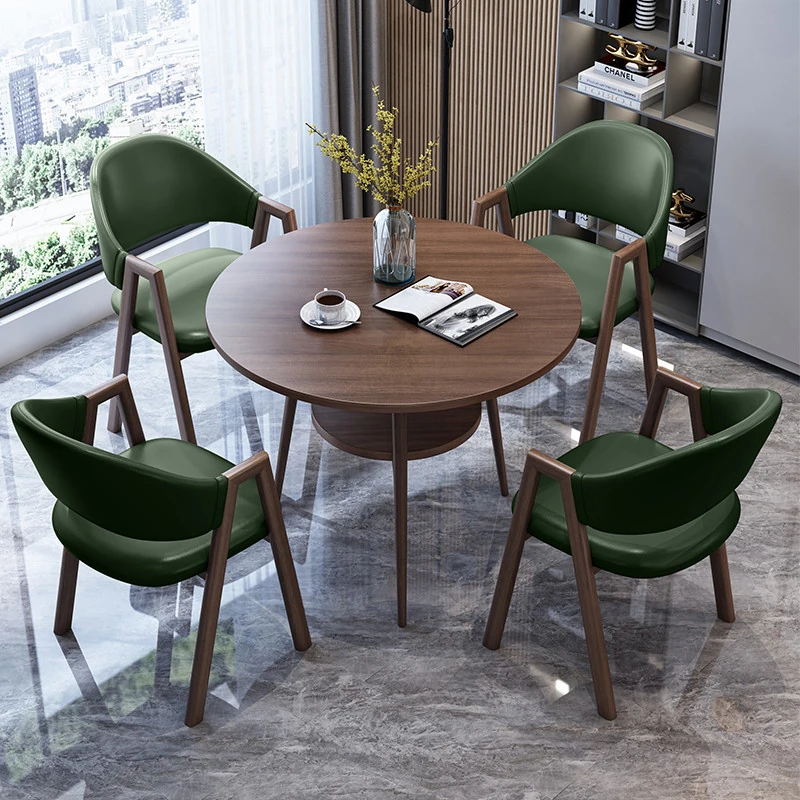 80cnウォールナット円卓+4ダークグリーン色レザー椅子