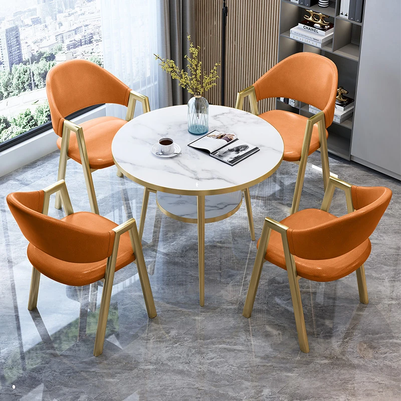 (80大理石模様円卓+4レザー椅子)オレンジ色