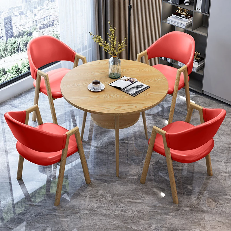 (80ナチュラルウッド色円卓+4レザー椅子)赤色