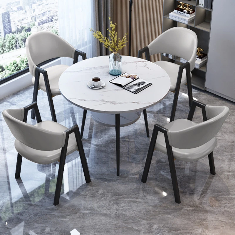 80cn大理石模様円卓+4ライトグレー色レザー椅子