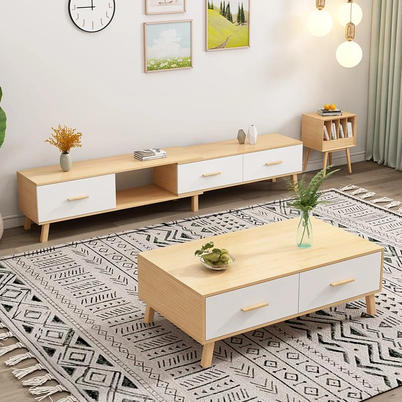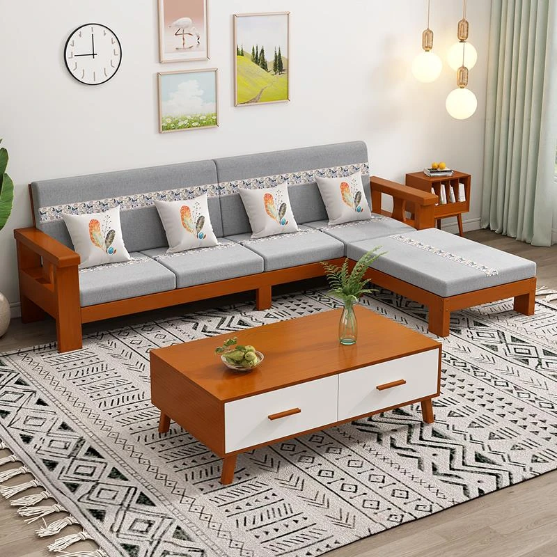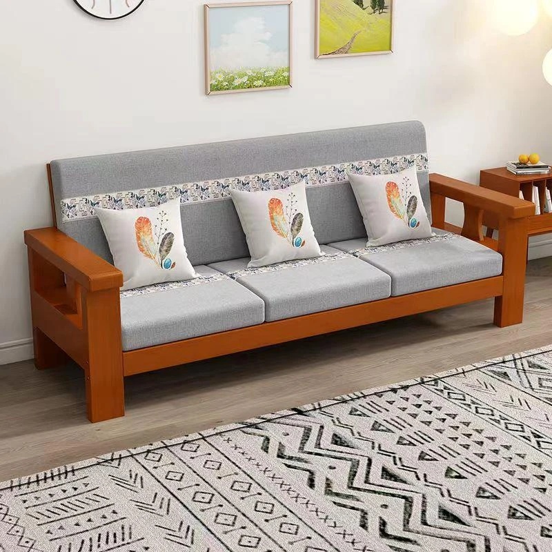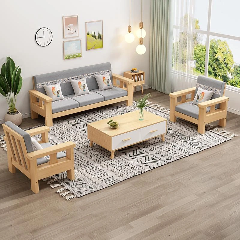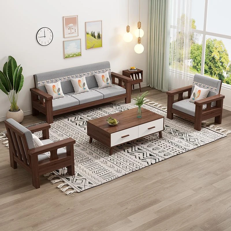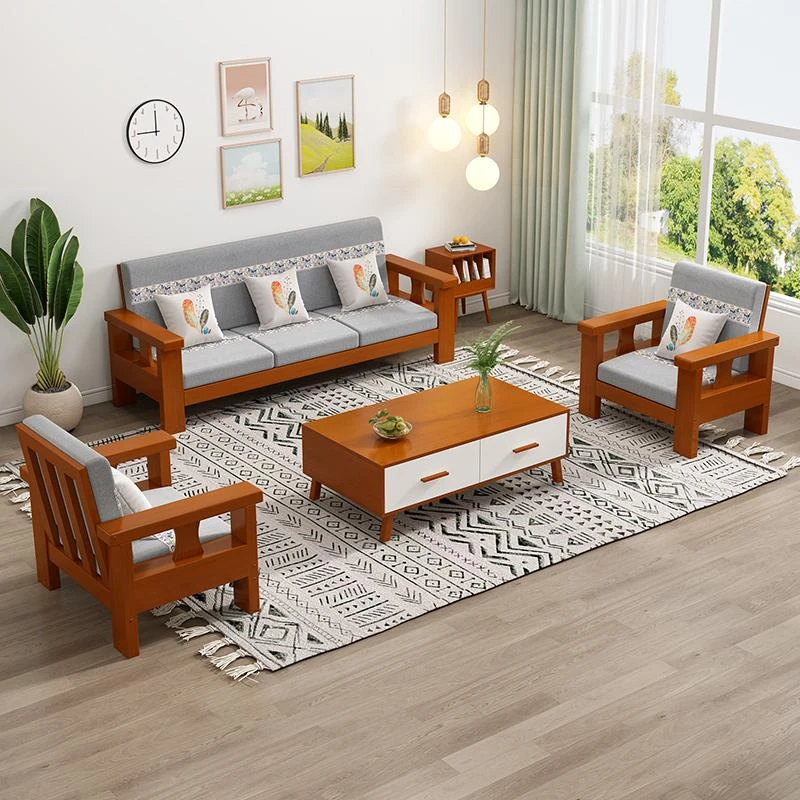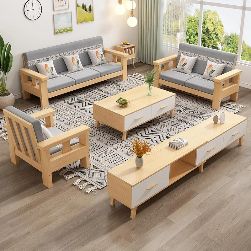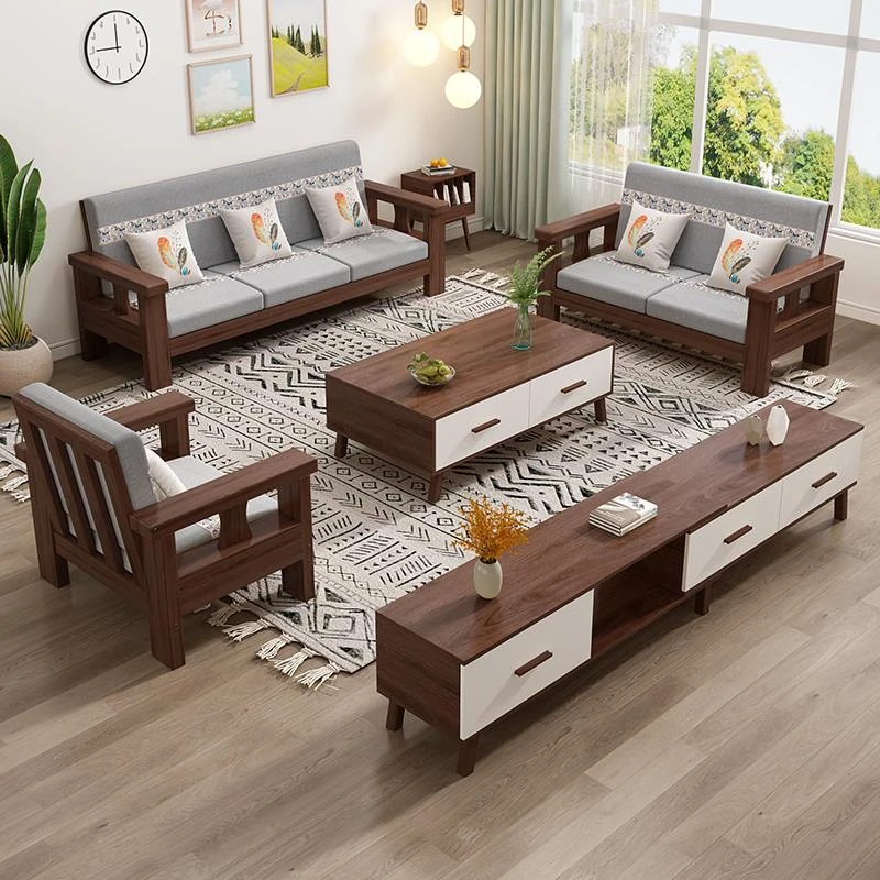 モダン中式のシンプルな実木製ソファ・テーブル・テレビ台セット - 小さなスペースにぴったりの家族向け家具!おしゃれで機能的、居心地の良いリビングを演出します。