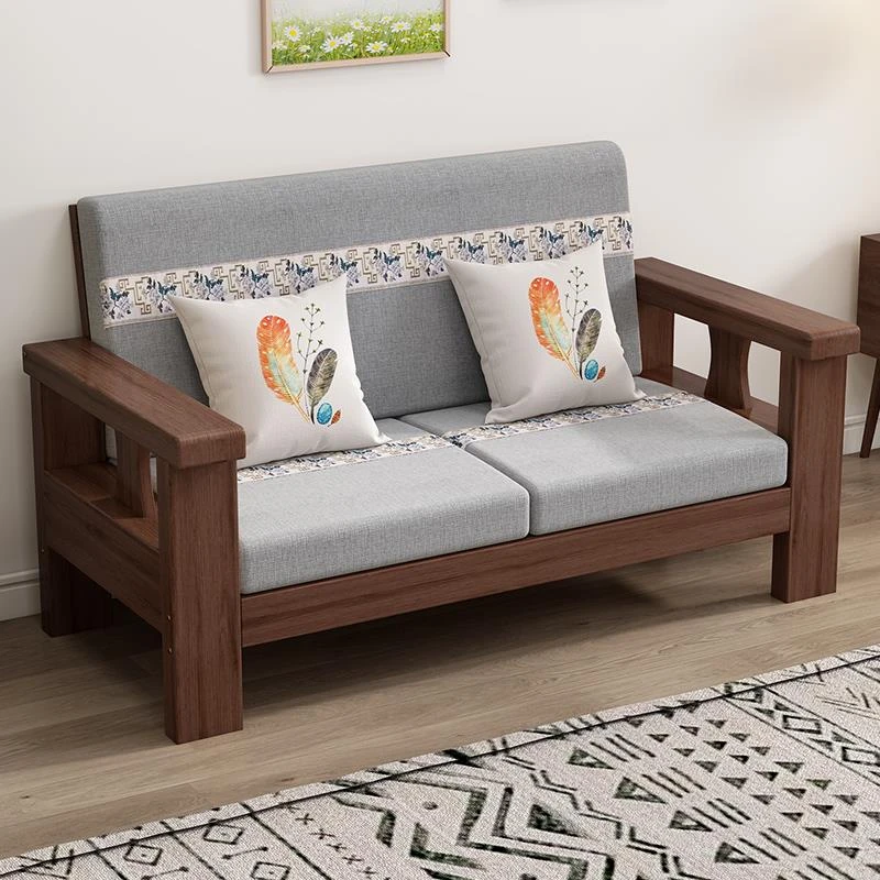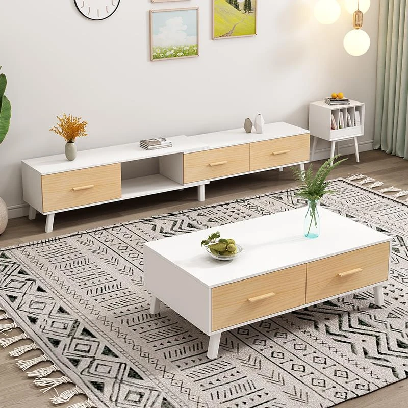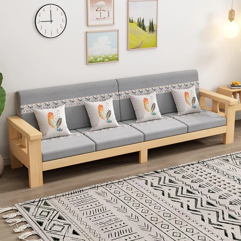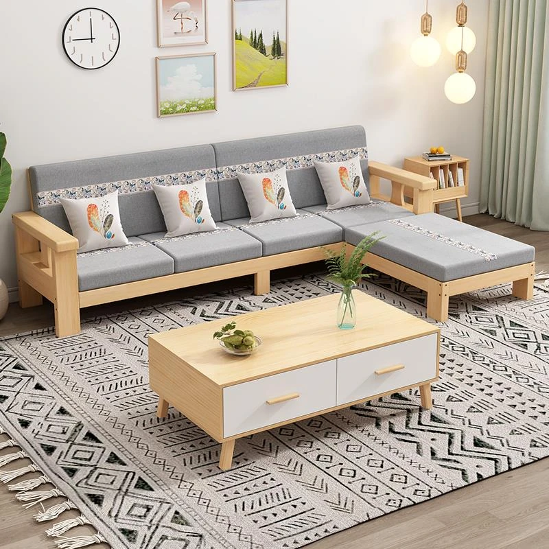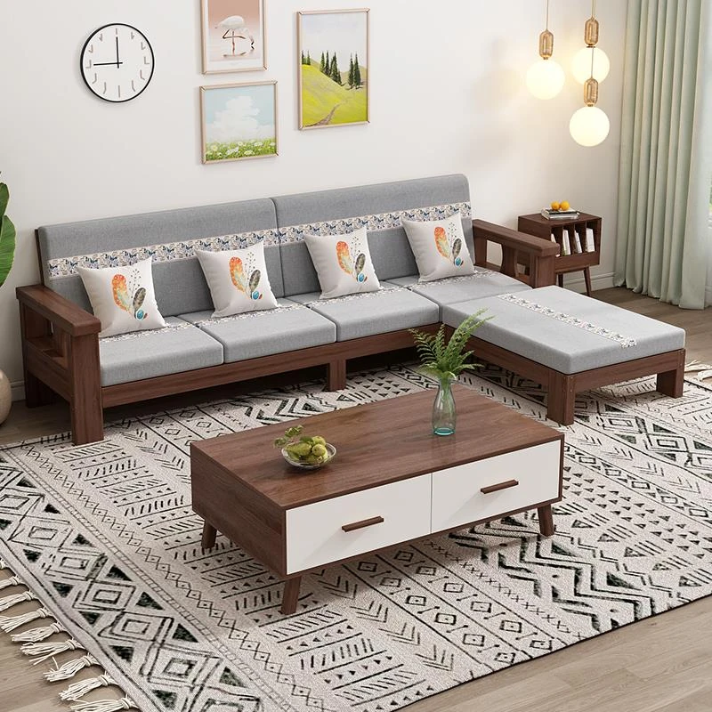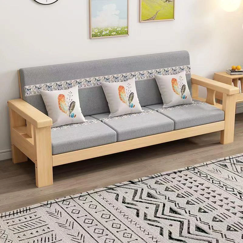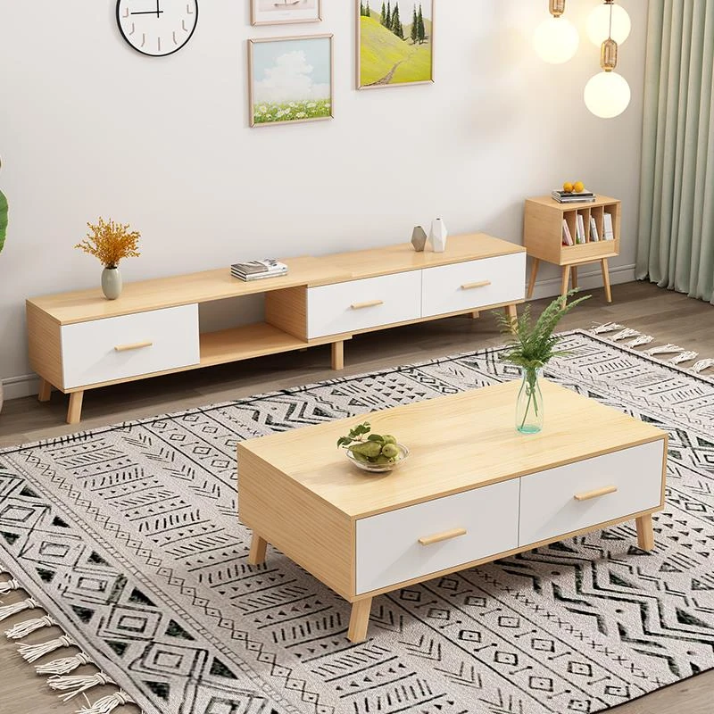 モダン中式のシンプルな実木製ソファ・テーブル・テレビ台セット - 小さなスペースにぴったりの家族向け家具!おしゃれで機能的、居心地の良いリビングを演出します。