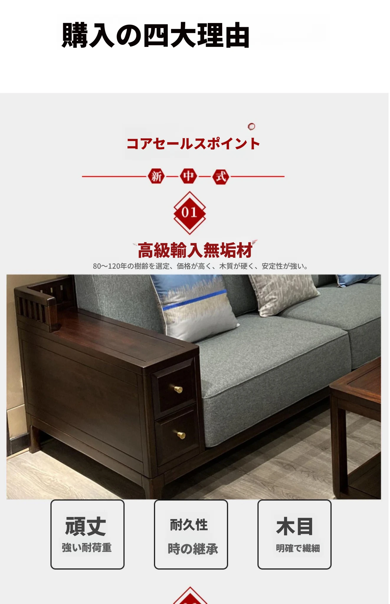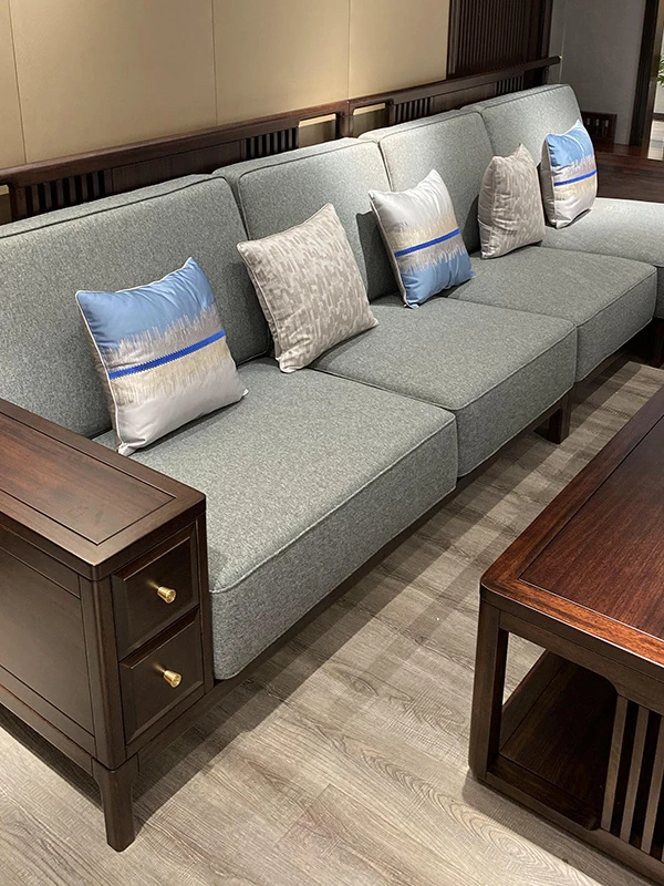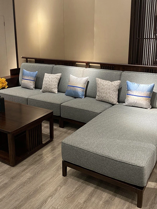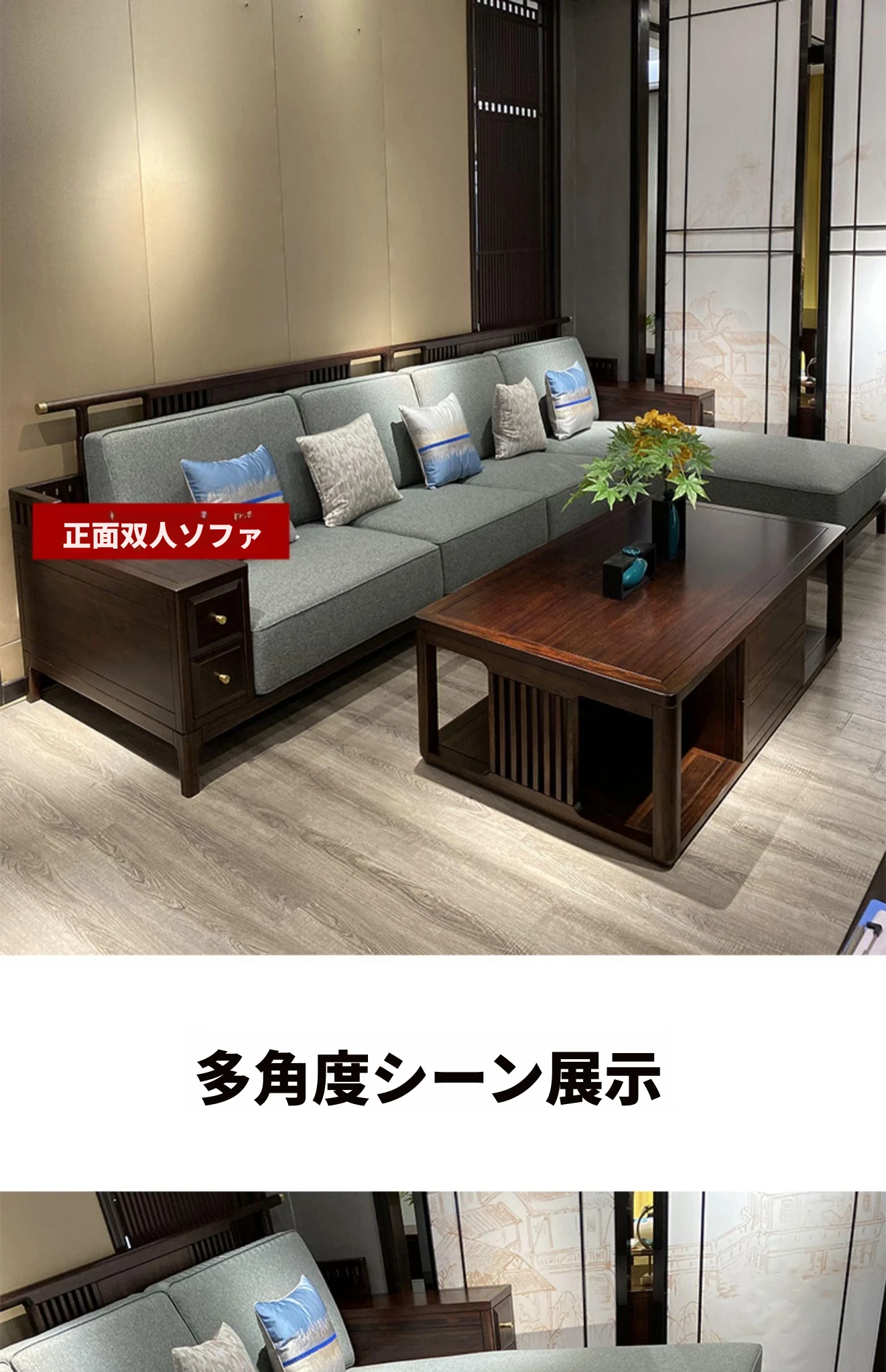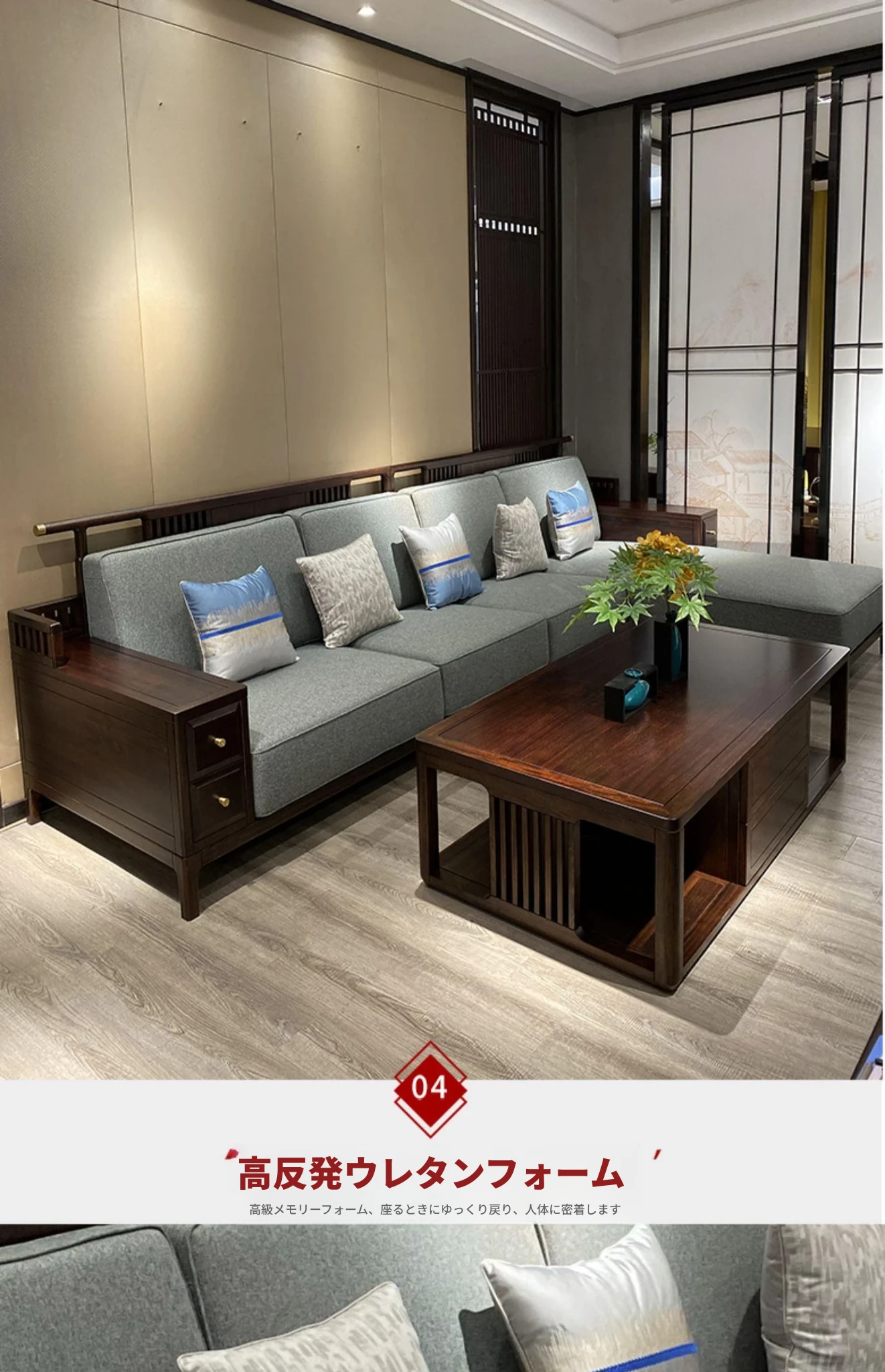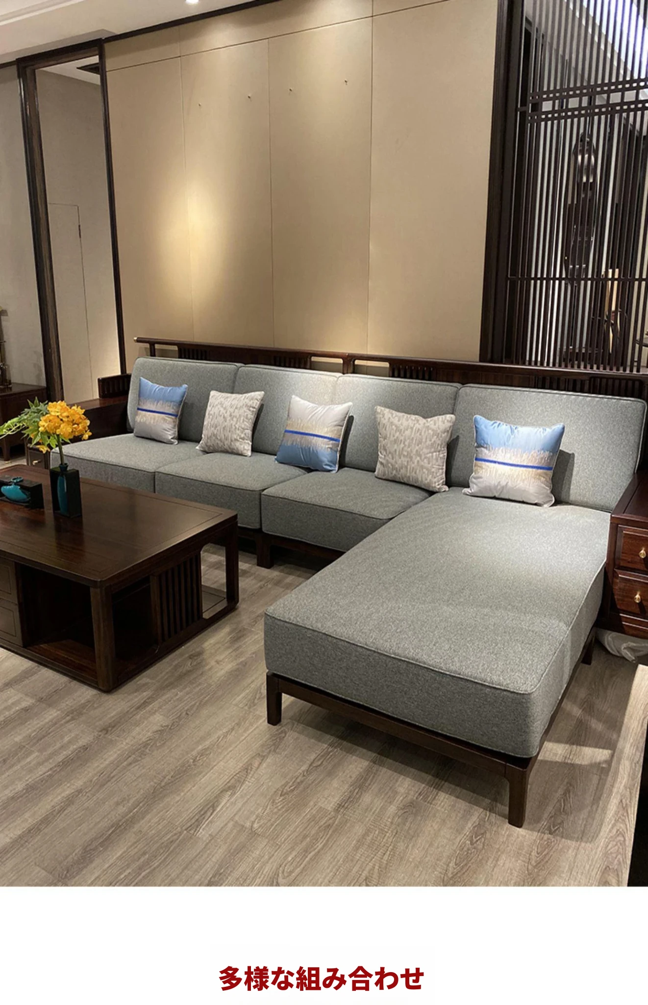 新デザイン!シンプルなリビング用檀木 L字型ソファー - 高級感あふれる実木と布のコンビネーション。新しい中華スタイルの家具で、心地よい空間を演出します。