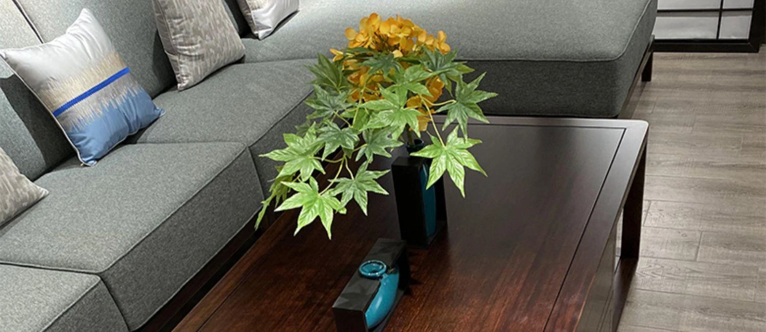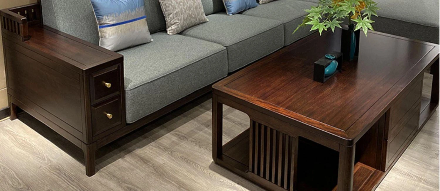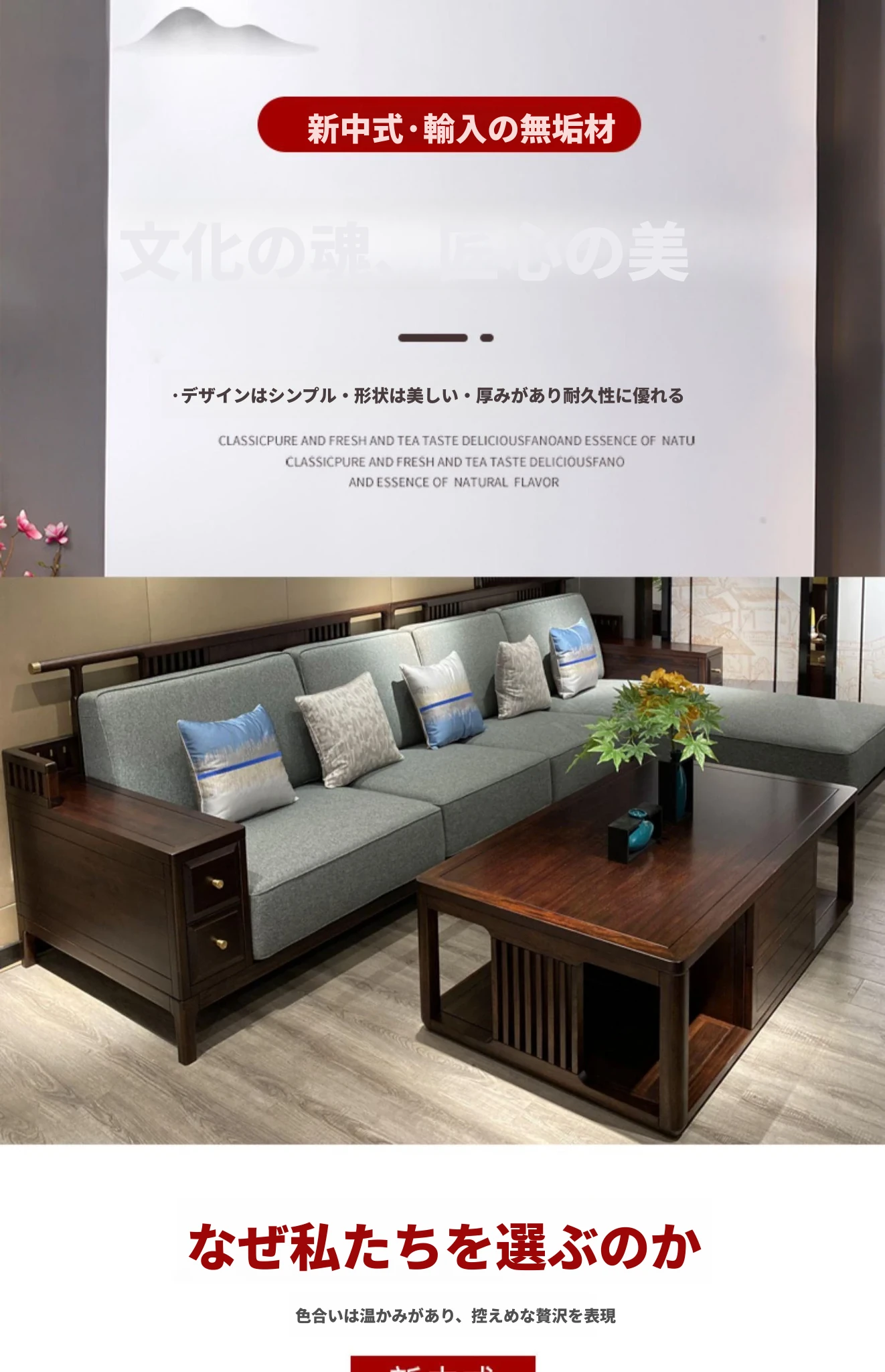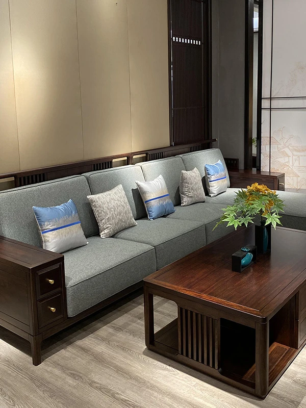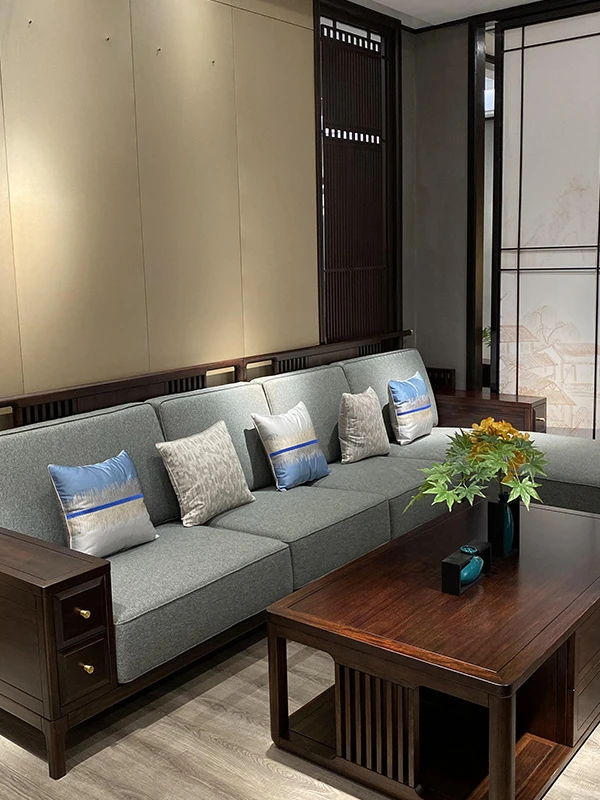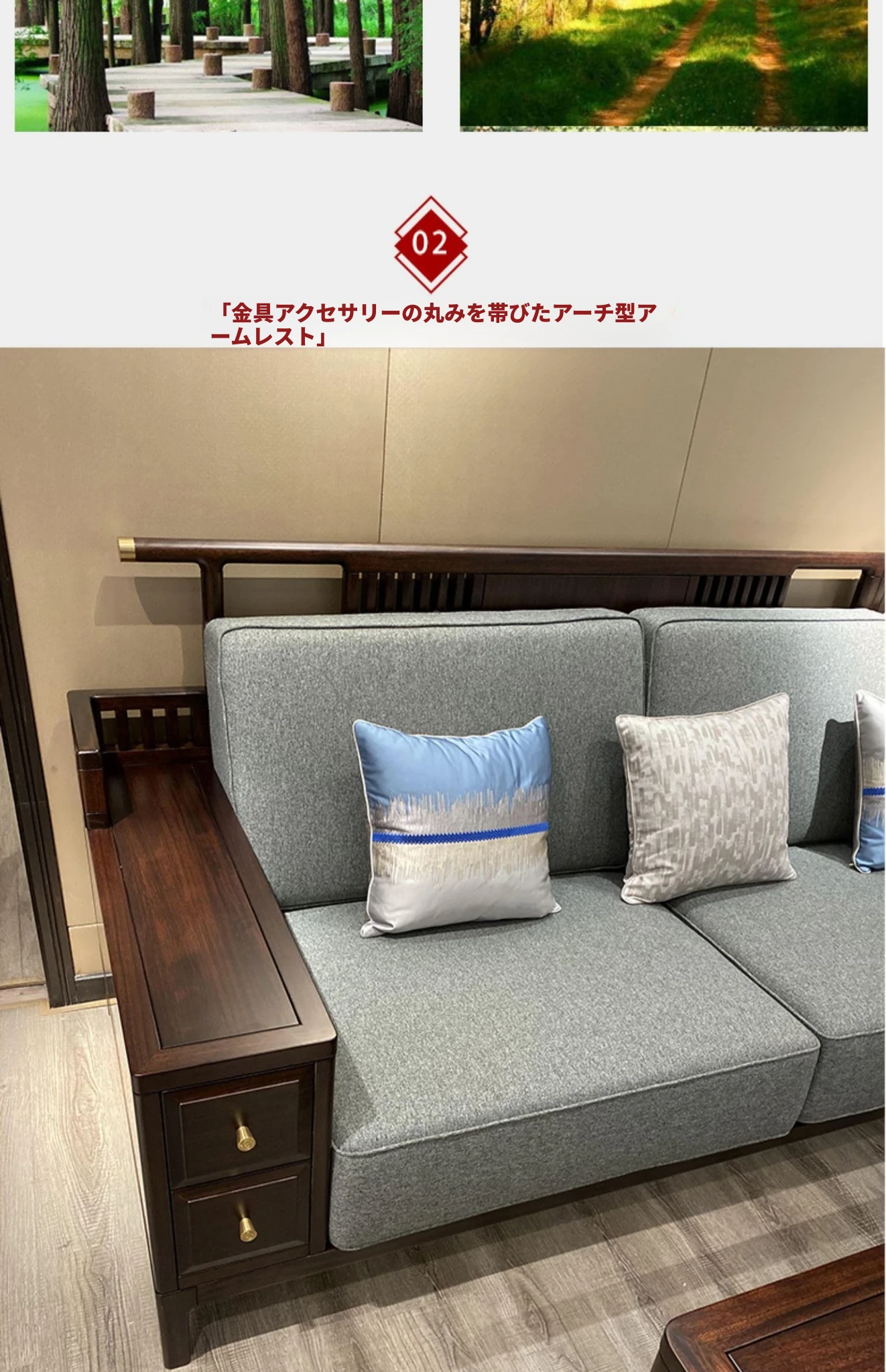 新デザイン!シンプルなリビング用檀木 L字型ソファー - 高級感あふれる実木と布のコンビネーション。新しい中華スタイルの家具で、心地よい空間を演出します。