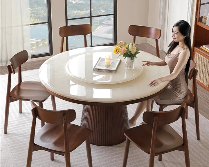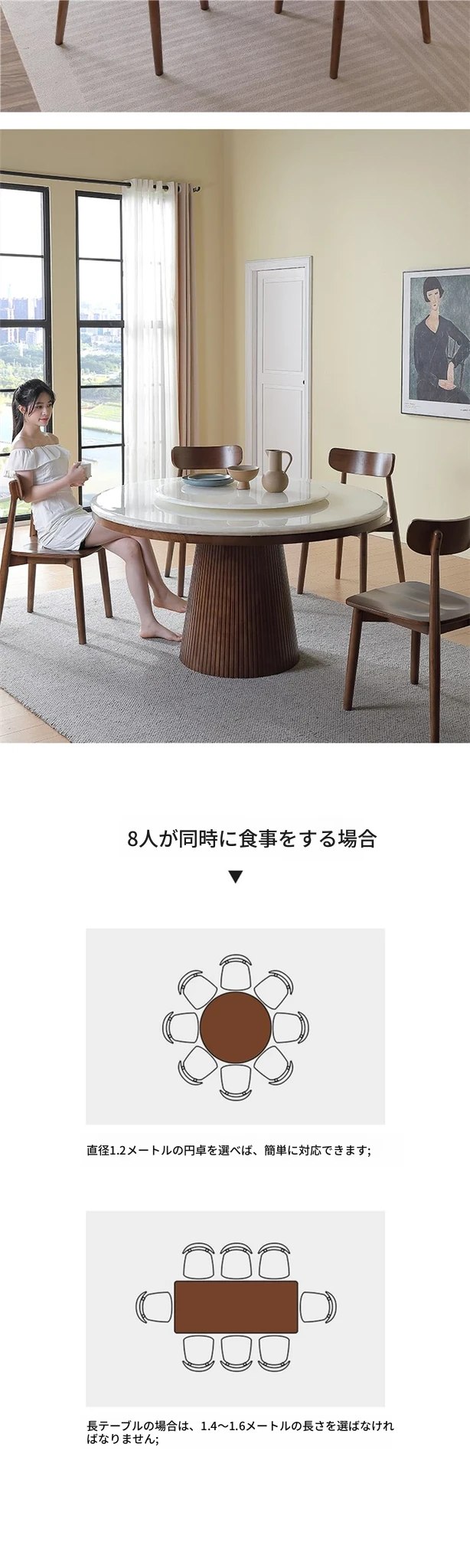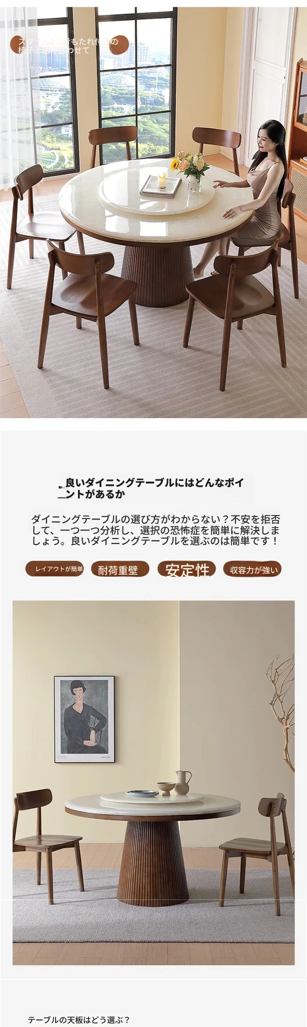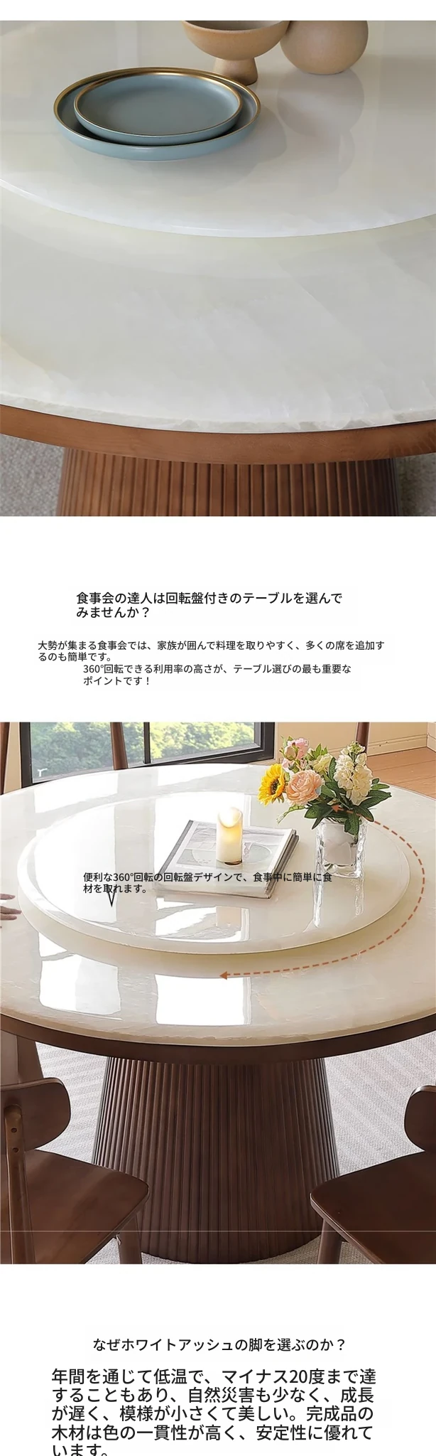 北欧スタイルの天然大理石ホワイトアイスフラワーサークルダイニングテーブル、回転盤付き、無垢材使用、6〜8人用の家族向け食卓。おしゃれで機能的、特別な食事の時間を演出します!