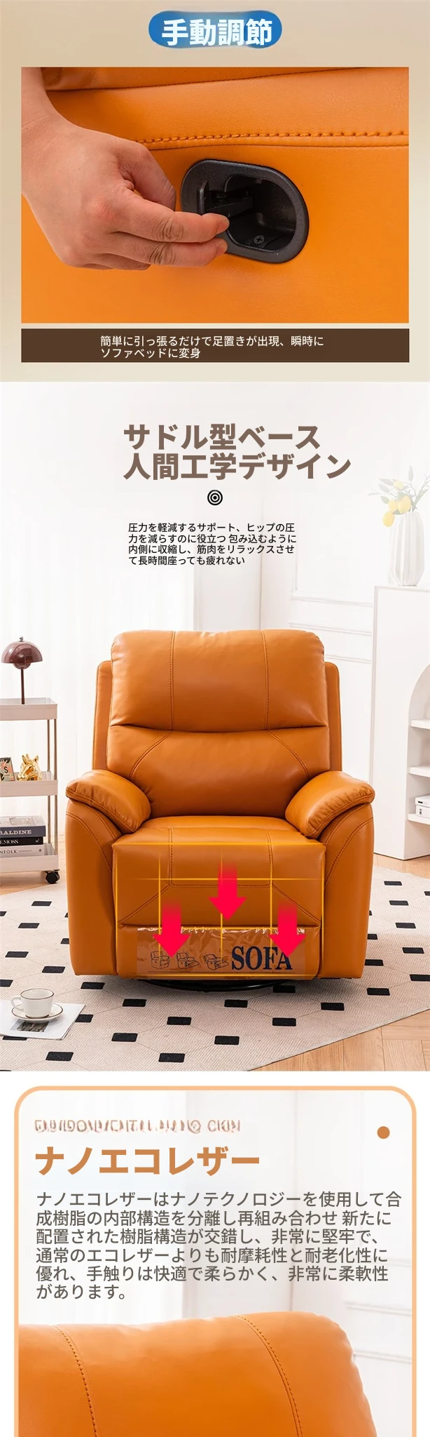 手動リクライニング+マッサージ機能+360回転+スイング