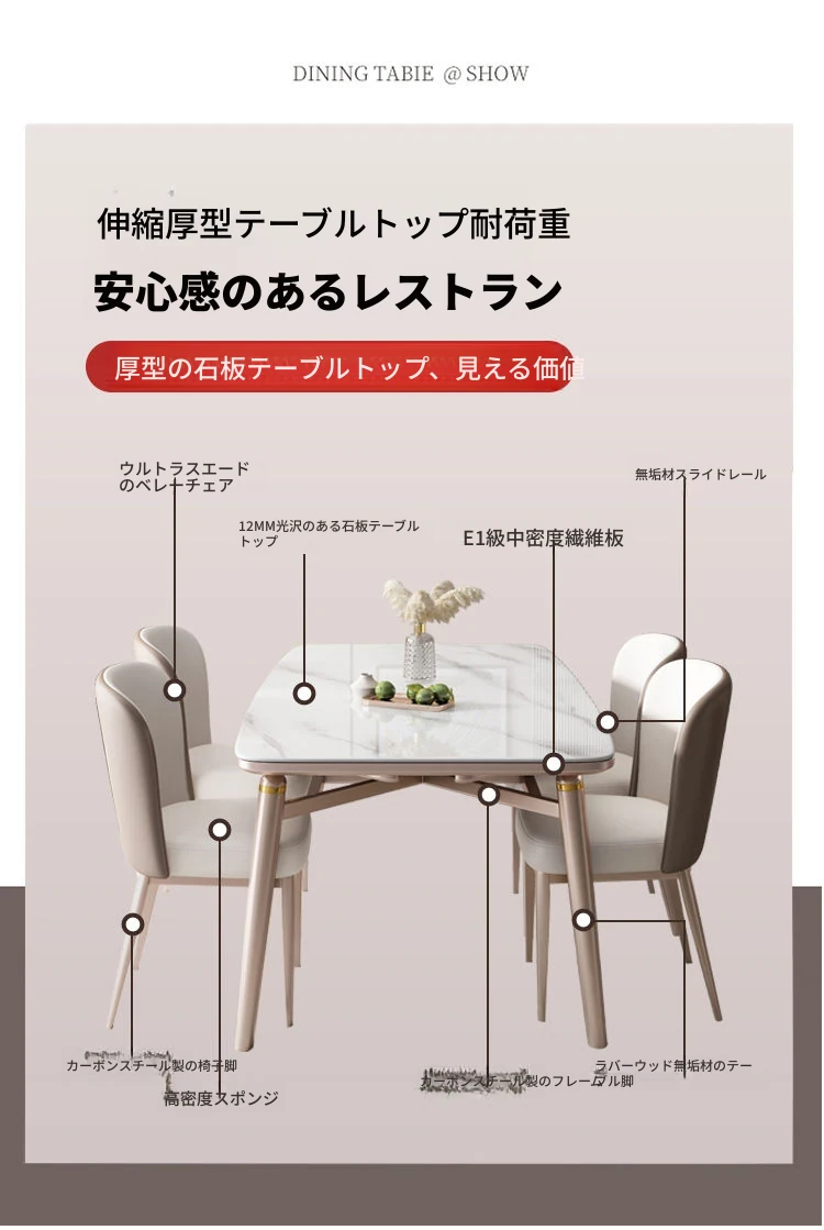 【12mm岩板】伸縮ダイニングテーブル+広派椅子*4