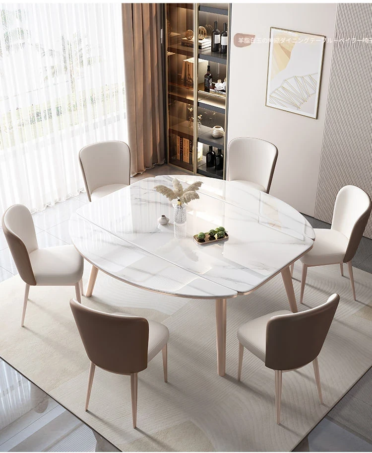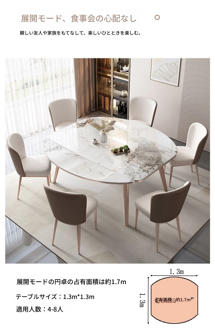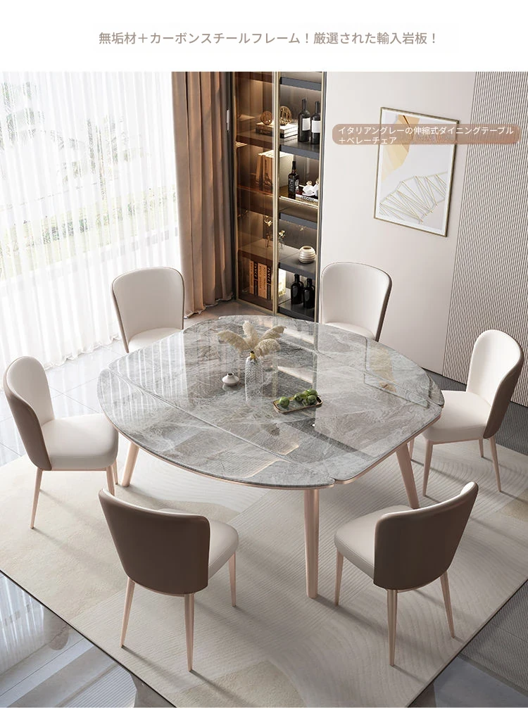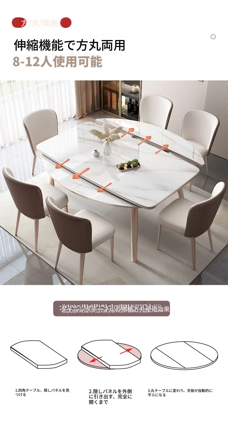 高級岩板使用の伸縮式ダイニングテーブル - 小さな家に最適!強化底板付きで、家族みんなが使える丸型・四角型の2WAYデザイン。おしゃれで機能的な空間を演出します!