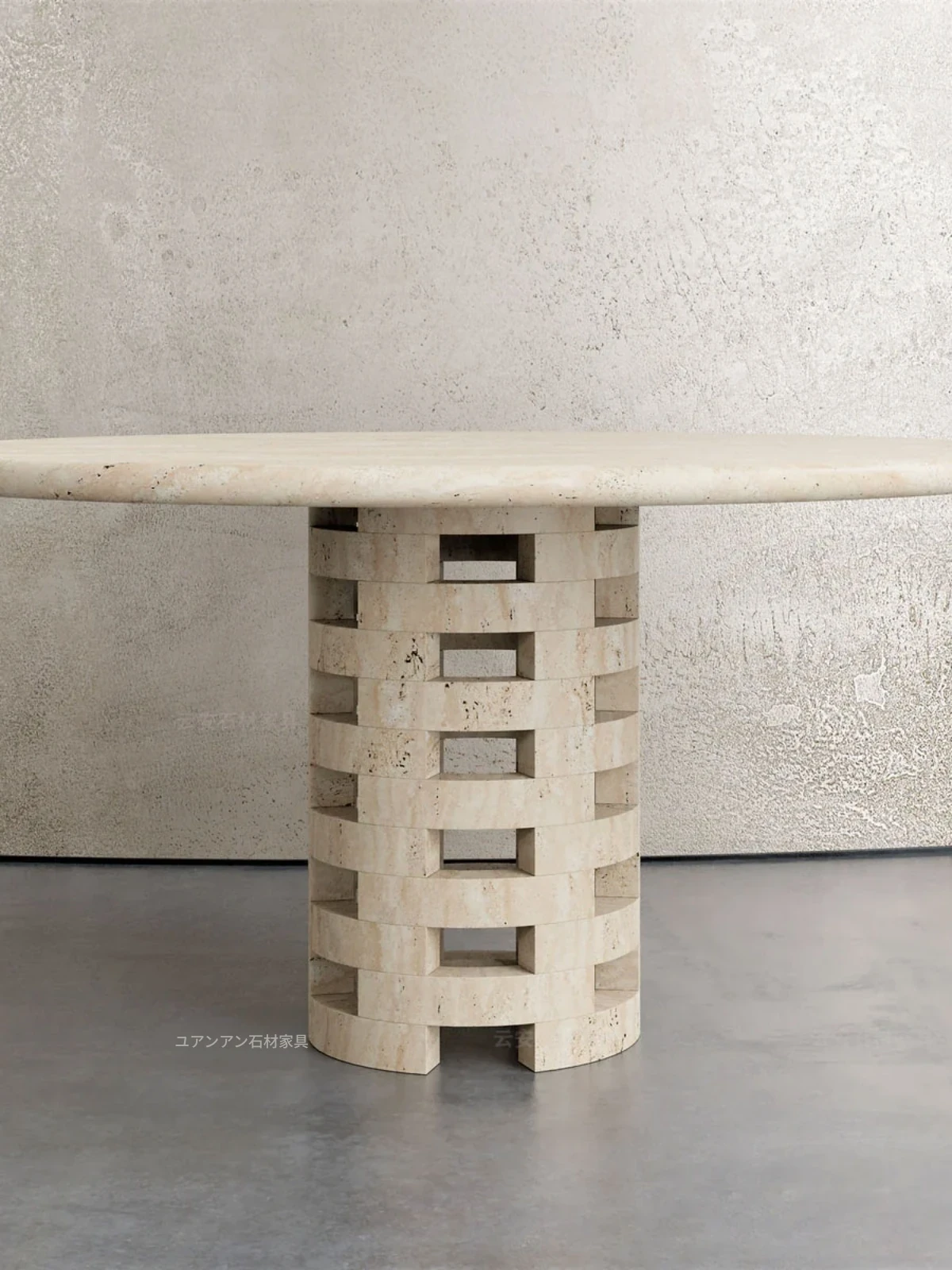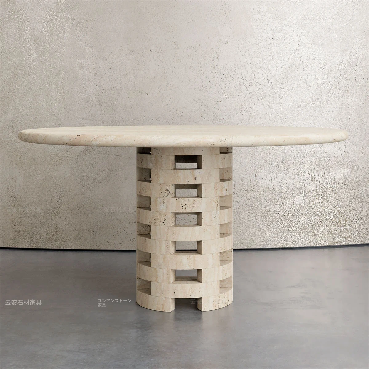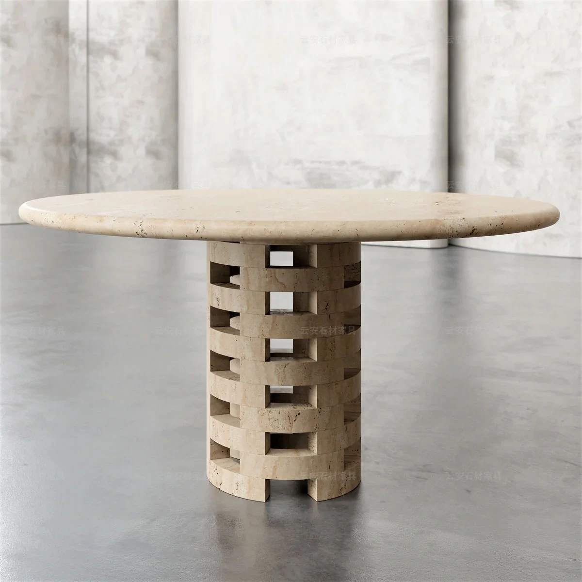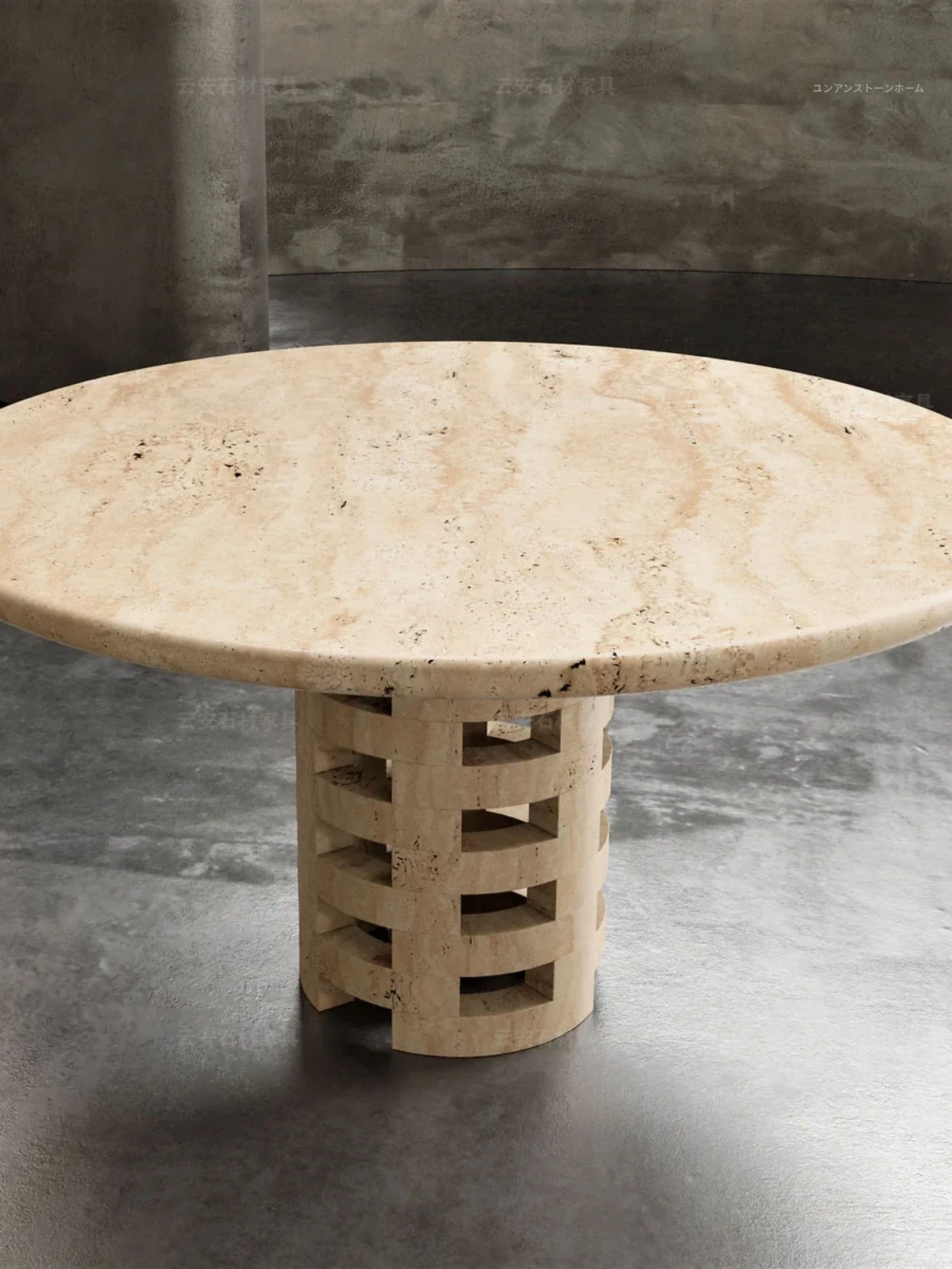 侘寂の美を感じる天然洞石マーブルラウンドダイニングテーブル - デザイナーの創造力が光る高級感あふれる別荘用アウトドアテーブル!特別なひとときを演出します。