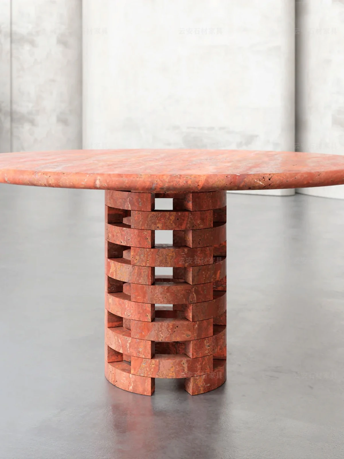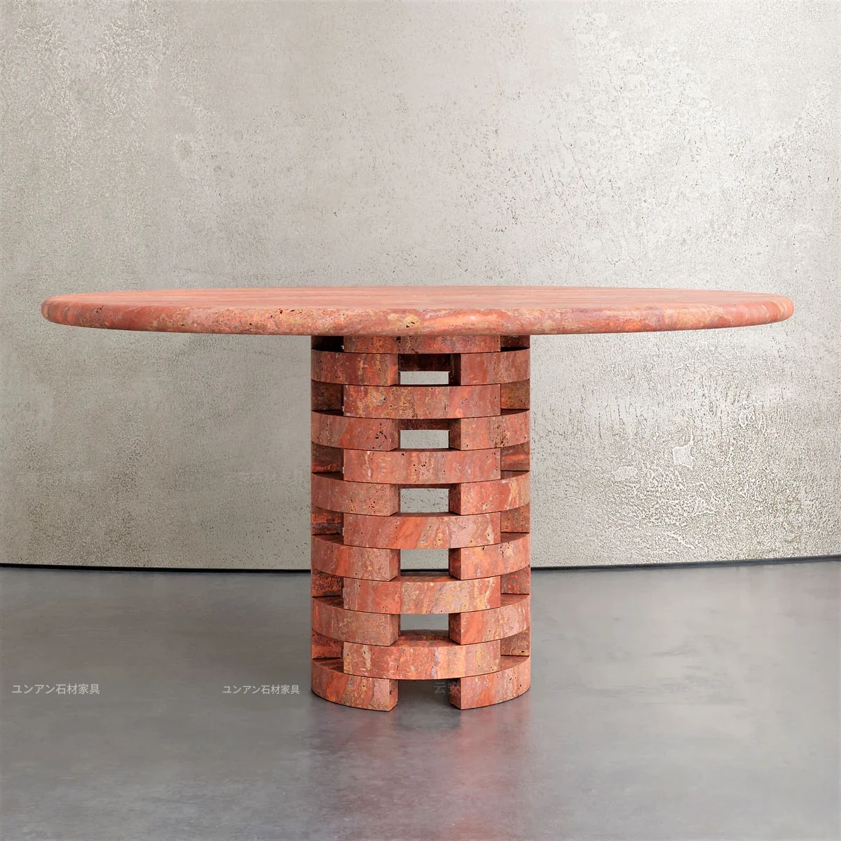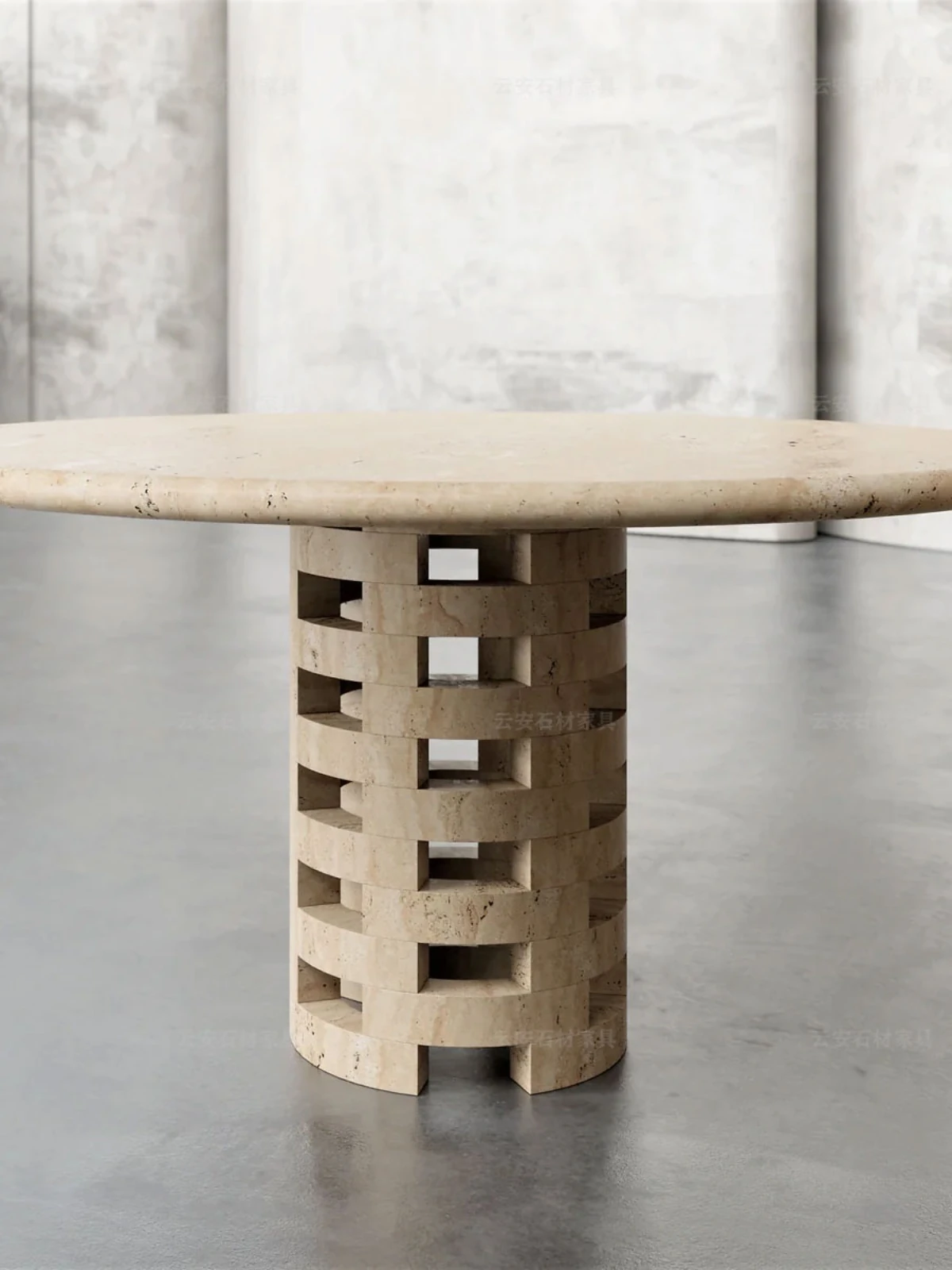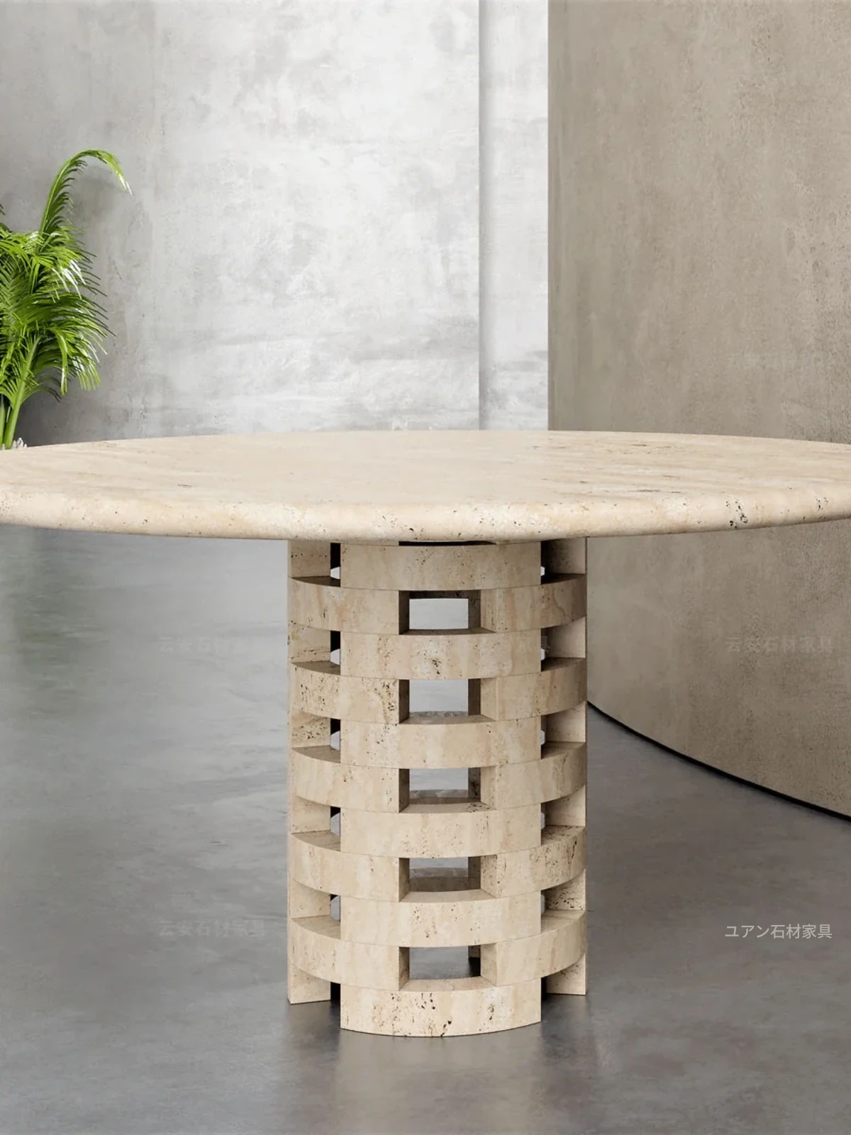 侘寂の美を感じる天然洞石マーブルラウンドダイニングテーブル - デザイナーの創造力が光る高級感あふれる別荘用アウトドアテーブル!特別なひとときを演出します。