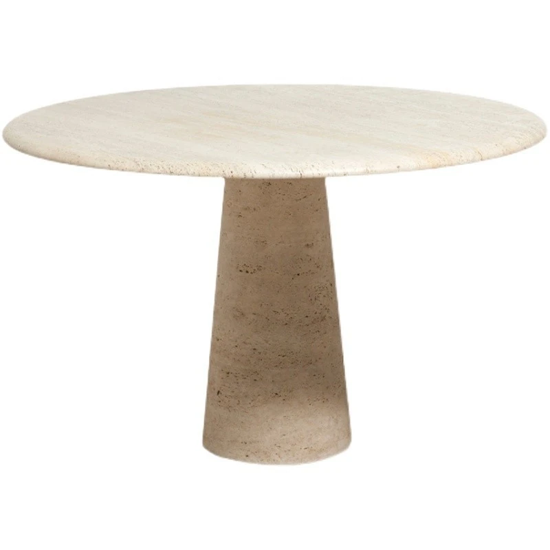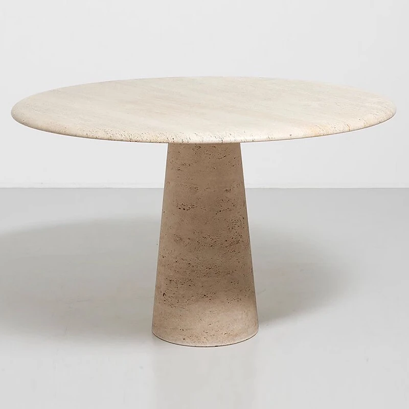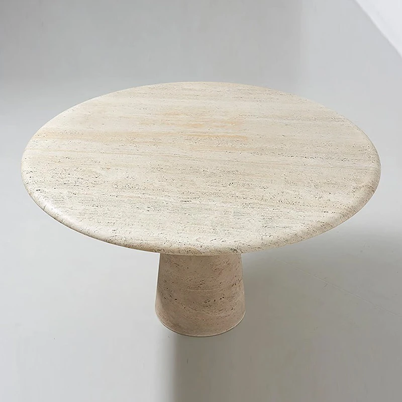 侘寂風の洞石を使用したラウンドダイニングテーブル - ヴィラや豪邸にぴったりの贅沢な天然大理石製!クリーミーな風合いで、広々としたリビングに華やかさをプラス。家庭用にも最適!