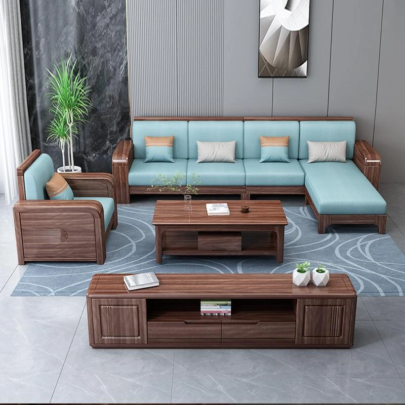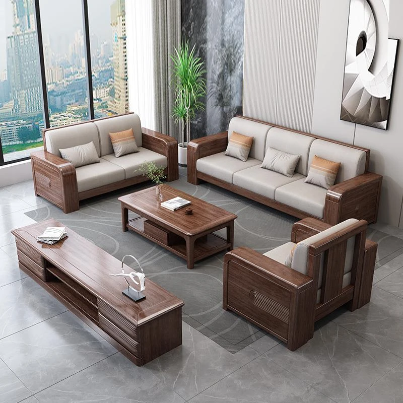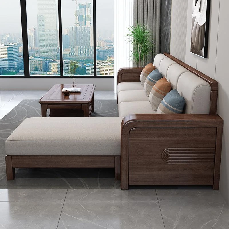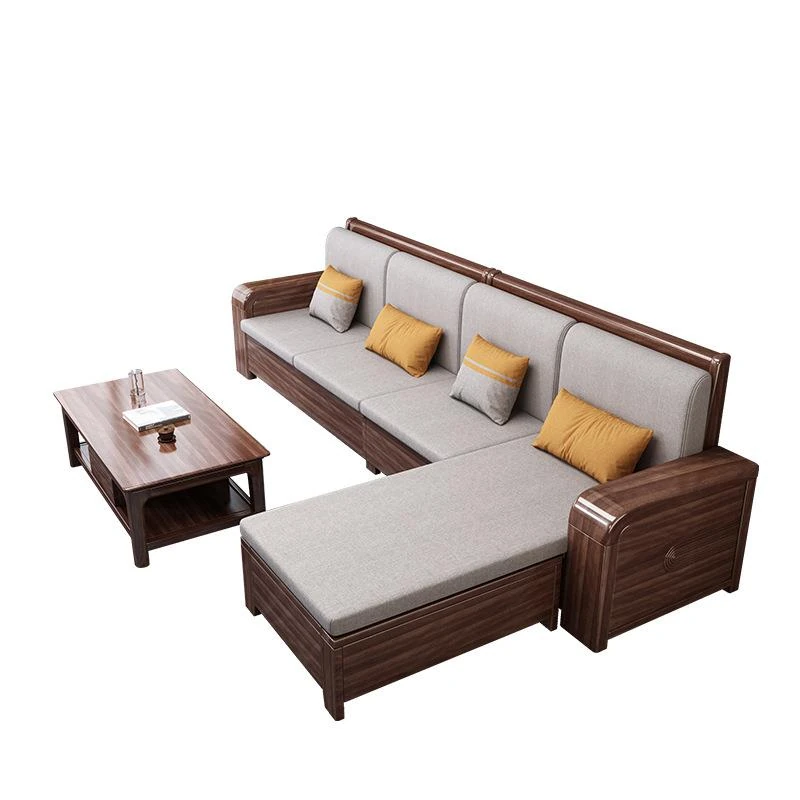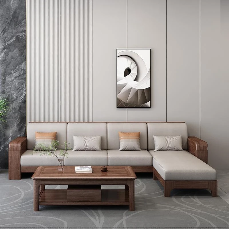 新中式胡桃木無垢材ソファセット - おしゃれな角型デザイン、リビングにぴったりな布製家具。優れた耐久性と快適さを兼ね備えたエレガントなインテリアを実現!